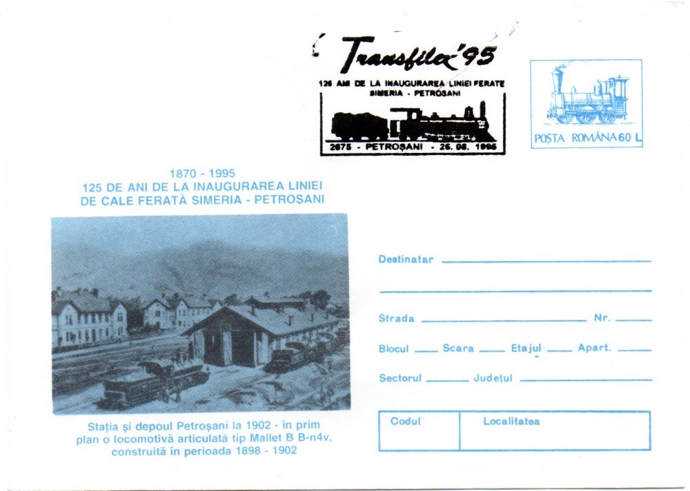 În vara anului 1995 Poșta Română a pus în circulație un set de trei plicuri - întreguri poștale având marca fixă de 60 lei (reprezentând o locomotivă cu abur) dedicată aniversării liniei de cale ferată Simeria - Petroșani. Primul plic (cod 031/95) prezintă în semiilustrație stația și depoul de locomotive din Petroșani în anul 1909. În prim-plan poate fi observată o locomotivă articulată tip Mallet B B-n4v construită în perioada 1898 - 1902.
